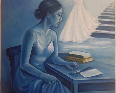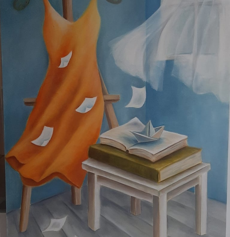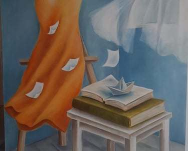 Books, staircases, silk dresses on hangers, and spaces that evoke a sense of emptiness frequently appear in her paintings.